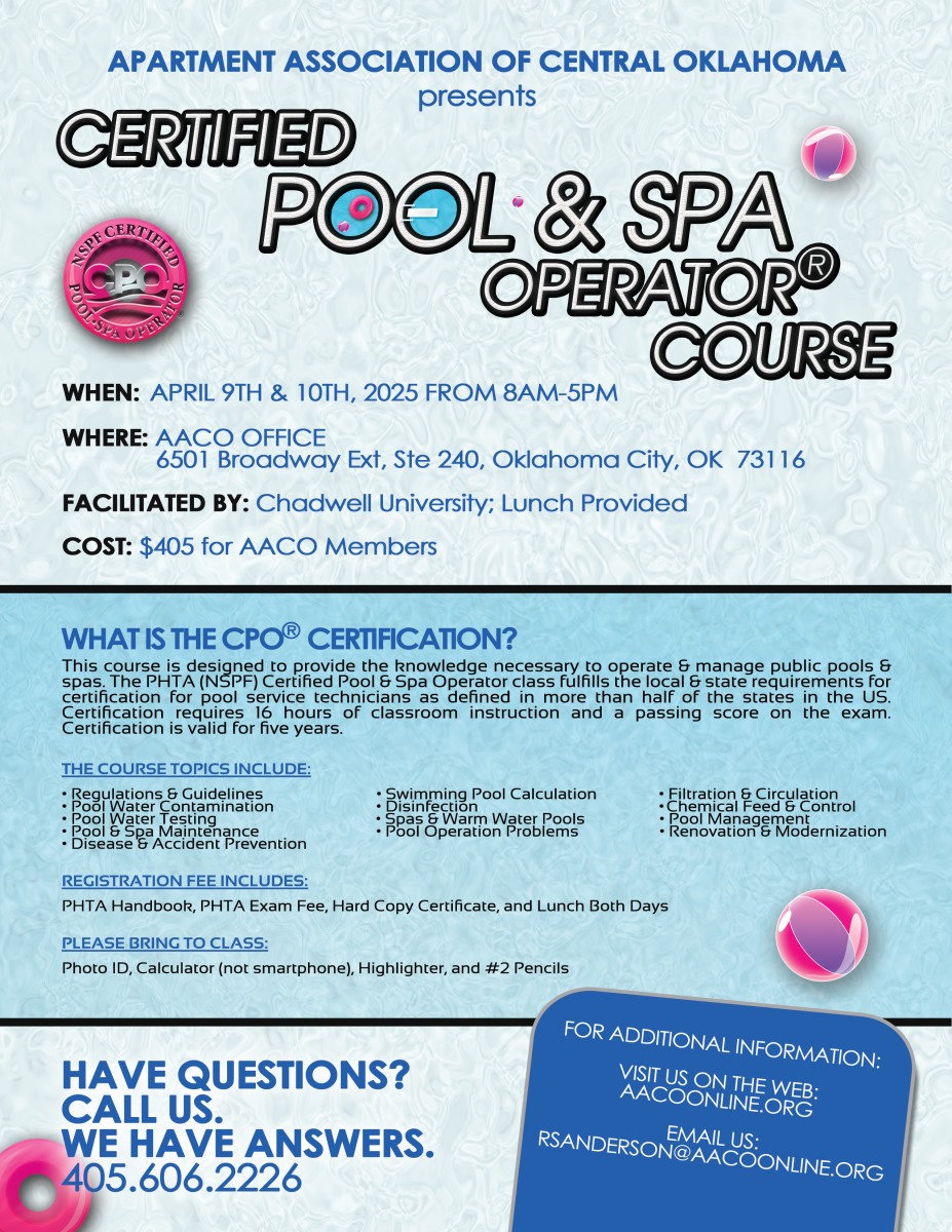 The Pool and Hot Tub Alliance (PHTA, formerly NSPF) CPO Certification course, presented by Chadwell University and hosted by the AACO, is a 2-day class followed by an open-book exam.