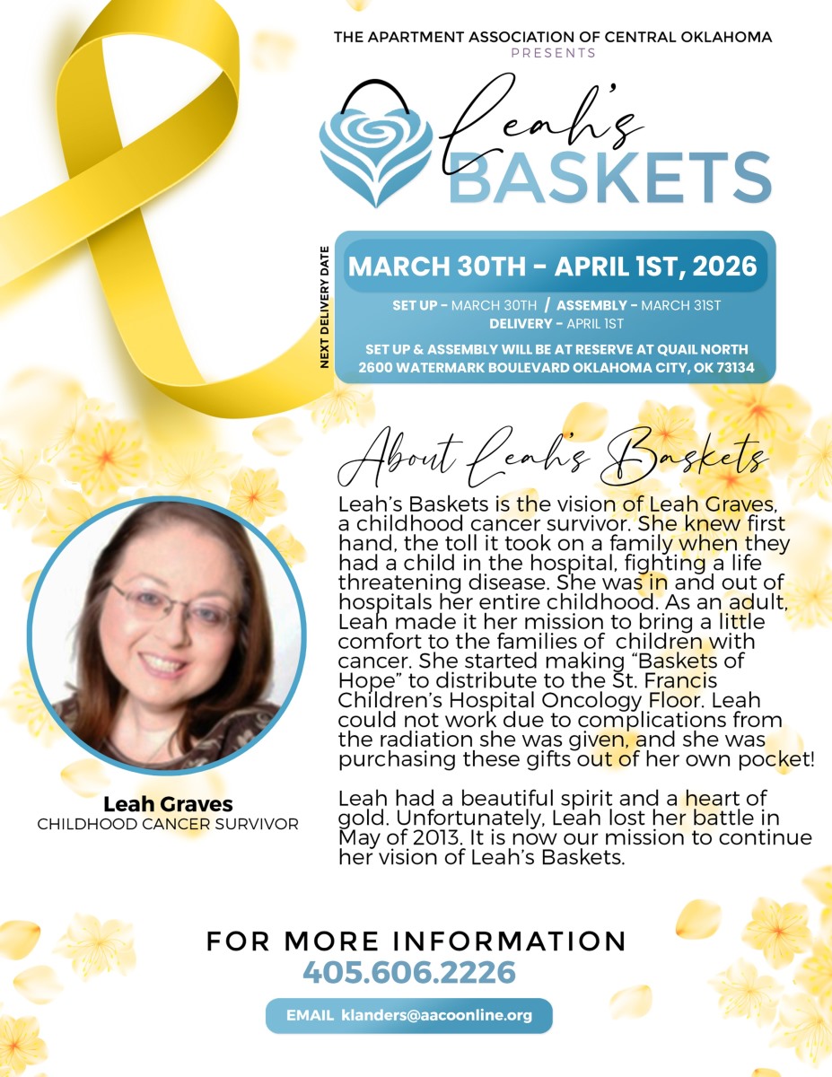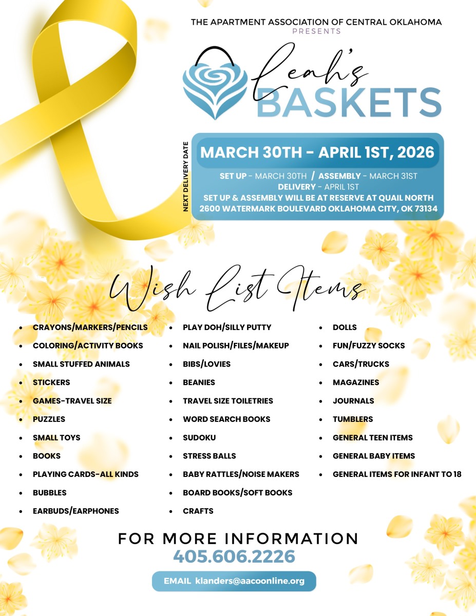 Our members assemble and deliver baskets to the Oklahoma Children's Hospital four times a year. We deliver 200 baskets for Valentine's Day, Easter, the Fourth of July, and Halloween. The children who receive baskets range in age from just a few days old to eighteen years old. These deliveries are made possible by donations from our members and our community.